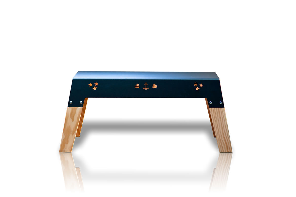 Der Aluminiumkorpus lässt sich auf Wunsch mit individuellen Design-Elementen oder Schriftzügen gestalten. Die Bank eignet sich sowohl für den Innenbereich, wie auch für den Außenbereich.